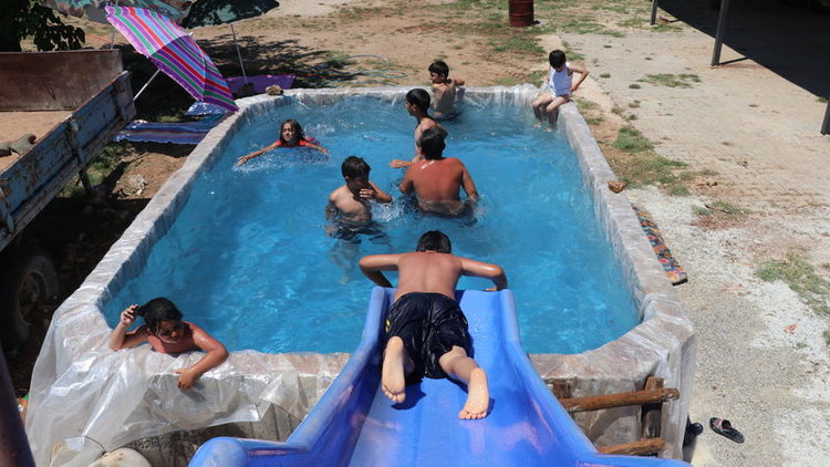 Alfaklar Mahallesi'nde yaşayan ve çoğu ailelerine tarlalarda yardım eden 10-13 yaşlarındaki bir grup çocuk, pazar yerinde yapılan ve kullanılmadığı için içi toprak ve atık malzemelerle dolan süs havuzunu yüzme havuzu haline getirmek için kolları sıvadı. Yaklaşık 4 metre uzunluğunda ve 1 metre derinliğindeki havuzu temizleyip aldıkları branda ve şeffaf naylonu zemine seren çocuklar, yakındaki bir musluktan da hortum yardımıyla su doldurdu. Mahalle bakkalı da kullanılmayan bir kaydırağı monte ettiği havuzu çocuklar için daha eğlenceli hale getirdi. Evden getirdikleri şemsiyelerin altında güneşlenen çocuklar, havuzda doyasıya eğleniyor.