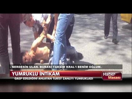Taksim'de Iraklı turist Muhammed Mustafa'yı darp ettiği iddia edilen şüpheli polisler tarafından yakalandı. Ancak, öfkeli turistten yumruk yemekten kurtulamadı
