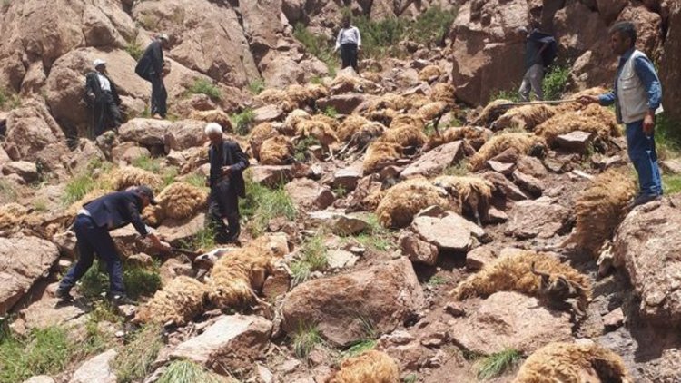 Biri uçurumdan atladı, diğerleri peşinden gitti. Yaklaşık 500 koyun, 20 metre yüksekten atlayarak telef oldu. Burası Van'ın Gürpınar ilçesi... 26 haneli Yapraklı Mezrası sakinlerine ait koyunlar, sarp kayalıkların olduğu bölgede otlatılıyordu. Koyunlardan biri karşı yamaca geçmek için aşağı atladı. Onu diğer koyunlar izledi. Çobanların haber vermesi üzerine bölgeye giden hayvan sahipleri şoke oldu. Çünkü yaklaşık 500 koyun telef olmuştu. Köylüler hayvanlarını tespit etti. Grup ardından olayı Gürpınar Kaymakamlığı ve İlçe Tarım Hayvancılık Müdürlüğü'ne de bildirerek yardım istedi. Ekipler bölgede inceleme yapacak.