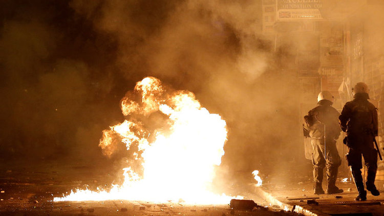 Yunanistan’ın başkenti Atina’da öğrenci protestolarına katılan bir kadın, bacağına gelen bir işaret fişeğiyle alev aldı.