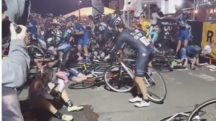 Amerika'da yapılan bisiklet yarışında iki bisikletlinin çarpışması sonucu arkalarından gelen bisikletliler zincirleme kaza oluşturdu. Bu zincirleme kaza sonucu adeta insanlardan oluşan bir dağ meydana geldi.