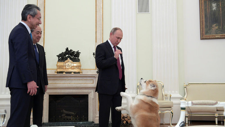 Rusya Devlet Başkanı Vladimir Putin, Kremlin'de buluştuğu Japon gazetecilere bir sürpriz yaptı. Toplantıya, kendisine Japonya tarafından hediye edilen köpeği Yume ile geldi.