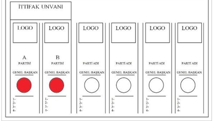 “İttifak yapan siyasi partiler, kuraya ittifak olarak dahil edilir ve oy pusulasında yan yana yer alır. Bu partilerin ittifak içerisindeki sıraları da kurayla belirlenir. Bu durumda ittifak yapan siyasi partilerin sütunlarının üzerinde; kısa kenarı iki santimetre, uzun kenarı bu partilerin sütunlarının genişliği ile sütunlarının aralığı toplamı kadar olan, dikdörtgen şeklinde ittifak unvanının yer alacağı ortak bir bölüm bulunur. İttifakın unvanı yoksa, ittifak unvanı bölümüne yalnız “İTTİFAK” ibaresi yazılır. Unvanı olmayan ittifakın birden fazla olması halinde, bunlar başvuru sırasına göre numaralandırılır. İttifak unvanı bölümü ile aralarındaki boşluk dahil ittifak yapan siyasi partilerin sütunlarının tamamı ittifak alanıdır.”