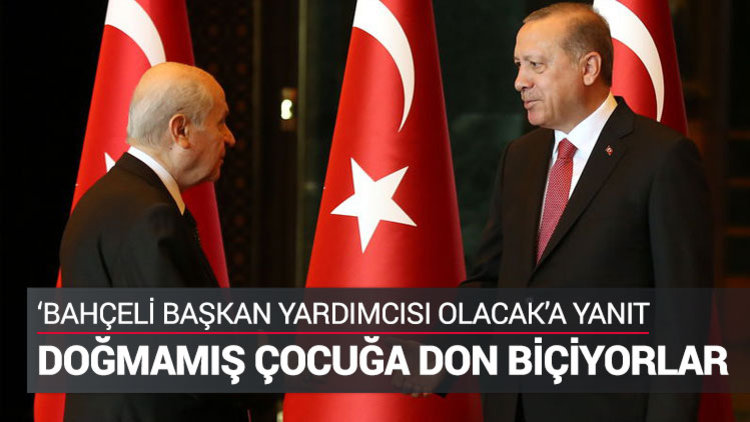 Cumhurbaşkanı Recep Tayyip Erdoğan, MHP Genel Başkanı Devlet Bahçeli'nin, yeni sistemde başkan yardımcısı olacağına ilişkin iddialarla ilgili, "Bunlar doğmamış çocuğa don biçiyorlar. Herkes bir defa yerini, konumunu bilsin. Biz Türkiye'de siyaset yapıyoruz. Yani sayın Bahçeli ile şu süreçte partimiz gayet güzel bir diyalog içinde oldu ve bundan sonraki süreçte de bu diyaloğun, bu dayanışmanın temenni ederim ki güçlenerek devamı Türkiye'nin geleceği bakımından çok çok önem arz etmektedir ve bu geleceği inşa ederken, ihya ederken görüşmeler neticesinde her şey olabilir." dedi.