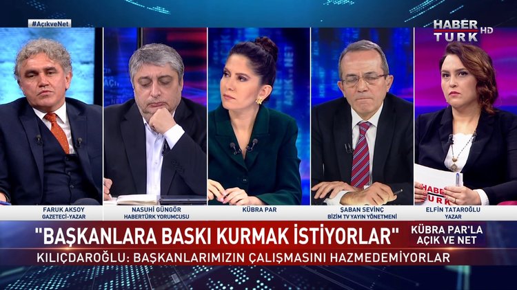 Açık ve Net’te Kübra Par soruyor… Konukları; Yazar Elfin Tataroğlu, Gazeteci Faruk Aksoy, Bizim TV Yayın Yönetmeni Şaban Sevin, Habertürk Yorumcusu Nasuhi Güngör ve Habertürk Yazarı-Ekonomist Gökhan Şen yanıtlıyor.