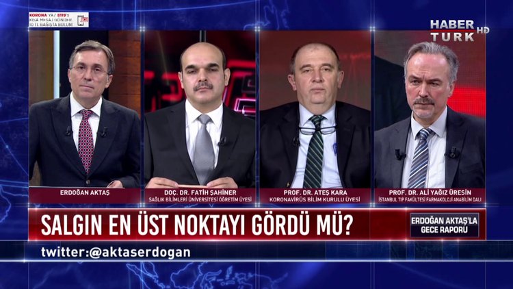 Gece Raporu’nda Erdoğan Aktaş, konukları İstanbul Tıp Fakültesi Farmakoloji Anabilim Dalı Prof. Dr. Ali Yağız Üresin, Koronavirüs Bilim Kurulu Üyesi Prof. Dr. Ateş Kara ve Sağlık Bilimleri Üniversitesi Öğretim Üyesİ Doç. Dr. Fatih Şahiner ile Türkiye’nin koronavirüs ile mücadelesini tüm yönleriyle konuştu.