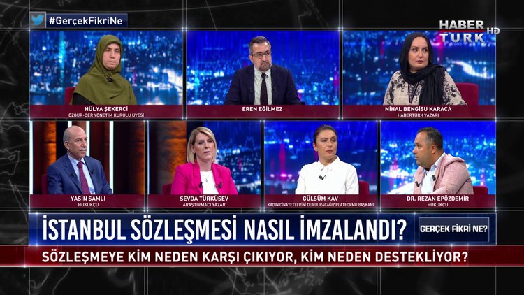 Eren Eğilmez soruyor; Özgür-Der Yönetim Kurulu Üyesi Hülya Şekerci, Habertürk Yazarı Nihal Bengisu Karaca, İletişim Uzmanı-Yazar Sevda Türküsev, Kadın Cinayetlerini Durduracağız Platformu Başkanı Gülsüm Kav, Hukukçular Dr. Rezan Epözdemir ve Yasin Şamlı Gerçek Fikri Ne'de yorumluyor.