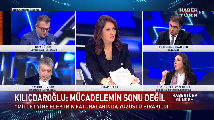 Habertürk Gündem’de Serap Belet soruyor… Konukları; Türkiye Gazetesi Yazarı Cem Küçük, Hukukçu Prof. Dr. Ersan Şen, Habertürk Yorumcusu Nasuhi Güngör ve CHP 25-26. Dönem Milletvekili Doç. Dr. Gülay Yedekçi yanıtlıyor.