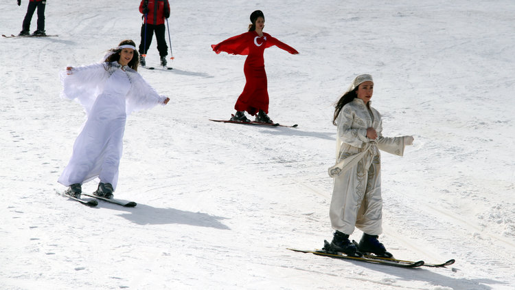 Kayseri Olgunlaşma Enstitüsü ile Erciyes A.Ş. tarafından ortaklaşa düzenlenen etkinlikte, 8'i kadın 10 kayakçı, Erciyes'te kayaklı defilede yöresel kıyafetleri sergiledi.