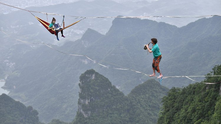 Hem ip üstünde yürüdüler... Hem de konser verdiler... Üstelik bunu yerden bin 400 metre yüksekte yaptılar. Fransız müzisyenlerin Çin'deki şovu nefes kesti.