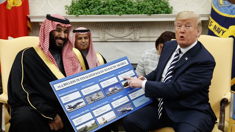 Trump, Selman ile yaptığı görüşmenin ardından gazetecilere açıklama yaparken, Suudi Arabistan'ın ABD'den milyarlarca dolarlık silah almasını övdü. Amerikan başkanı, basın mensuplarına, üzerinde Suudi Arabistan'a son dönemde satılan 12,5 milyar dolarlık silahların olduğu karton bir pano gösterdi ve "Onlar için çerez parası" dedi.