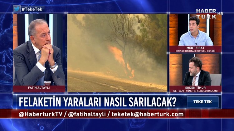 Fatih Altaylı ile Teke Tek’te afet bölgesinde neler yaşanıyor? Yanan yerlere müdahale nasıl olmalı? Hasar gören evlere ne olacak? Yangın felaketinin yaraları nasıl sarılacak? Soruları masaya yatırılıyor.